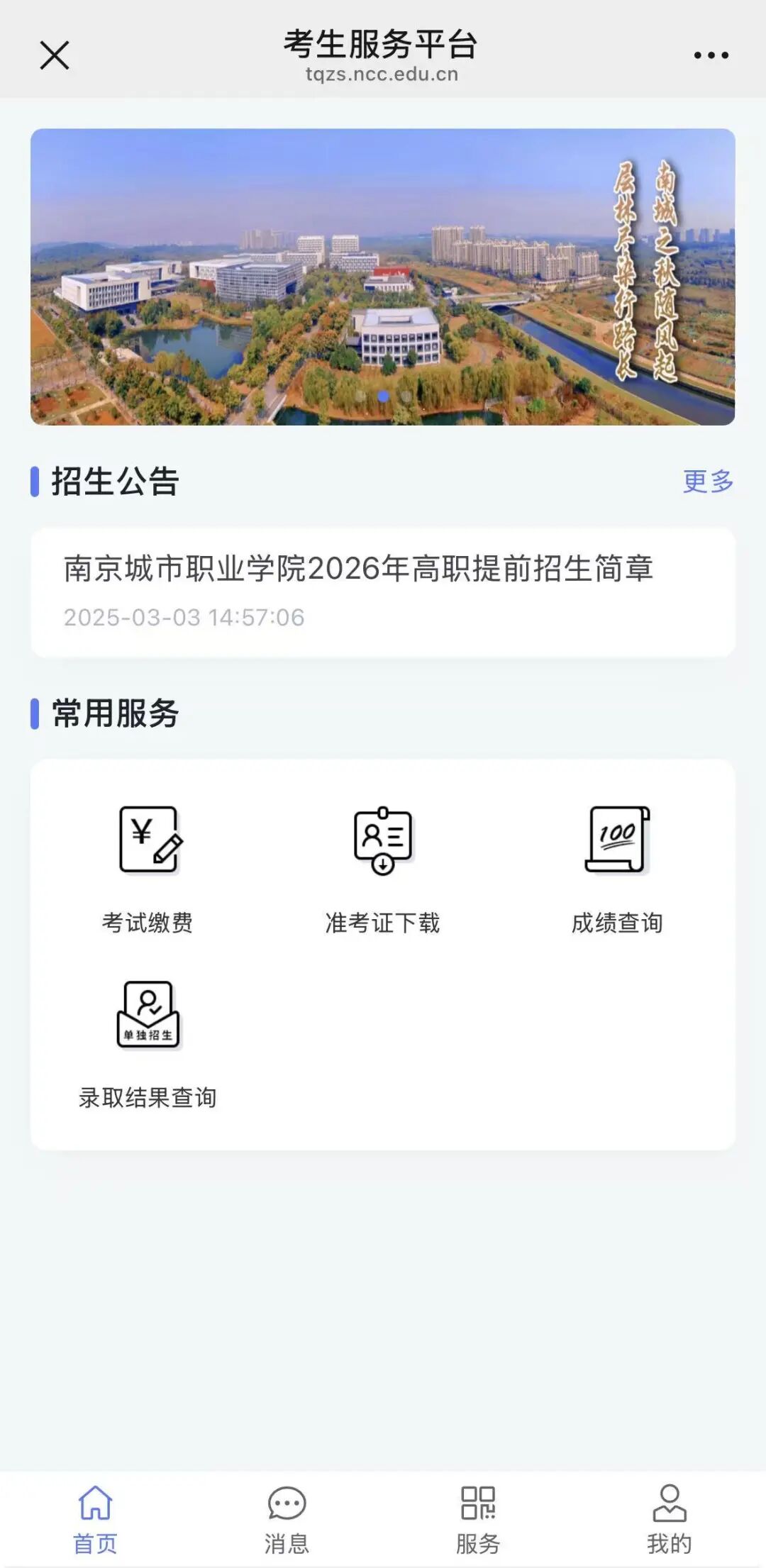 我校2026年提前招生开通考生服务平台,为大家提供缴费、准考证打印以及后期的成绩查询、录取查询等服务。